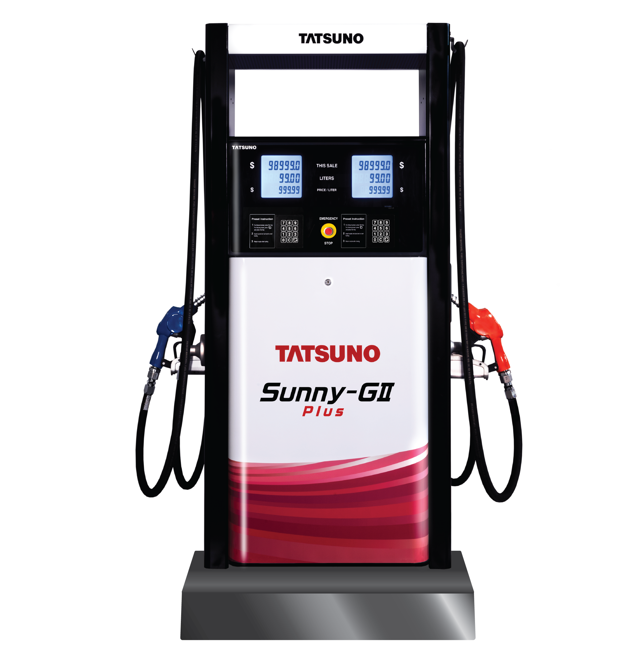You can choose the model that fits your needs the best. Sunny-GII Plus comes in three different models depending on the number of pumps, nozzles, and number of displays with a different options. ・Non-resettable electromagnetic totalizer ・Emergency stop switch ・Double Swivel ・POS Interface